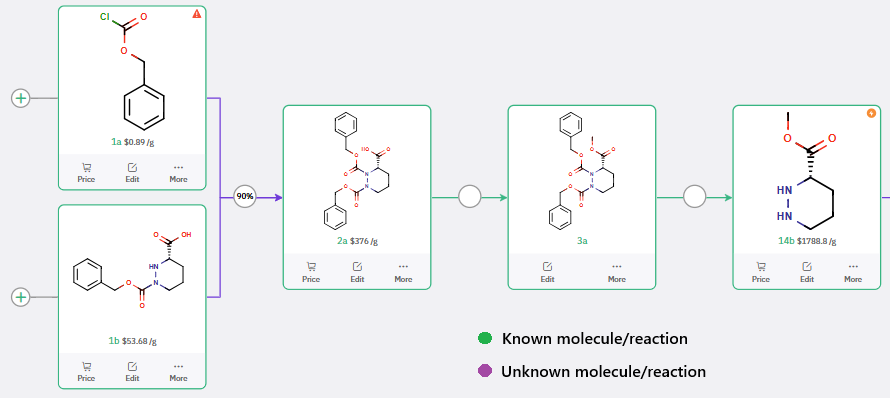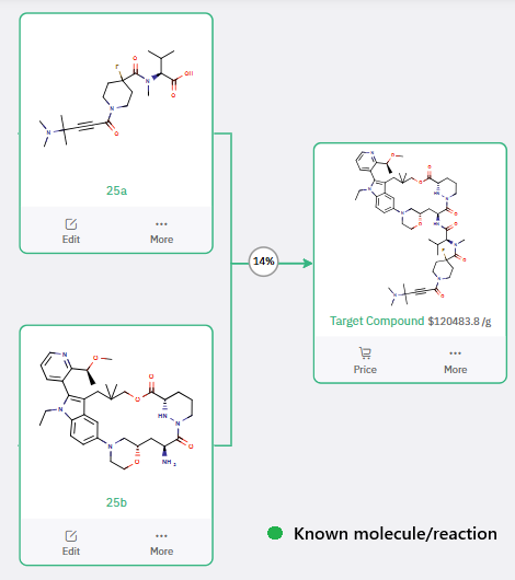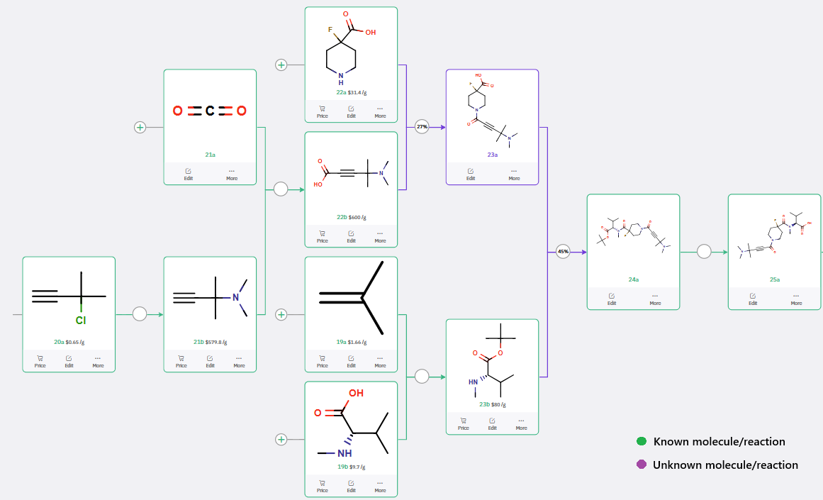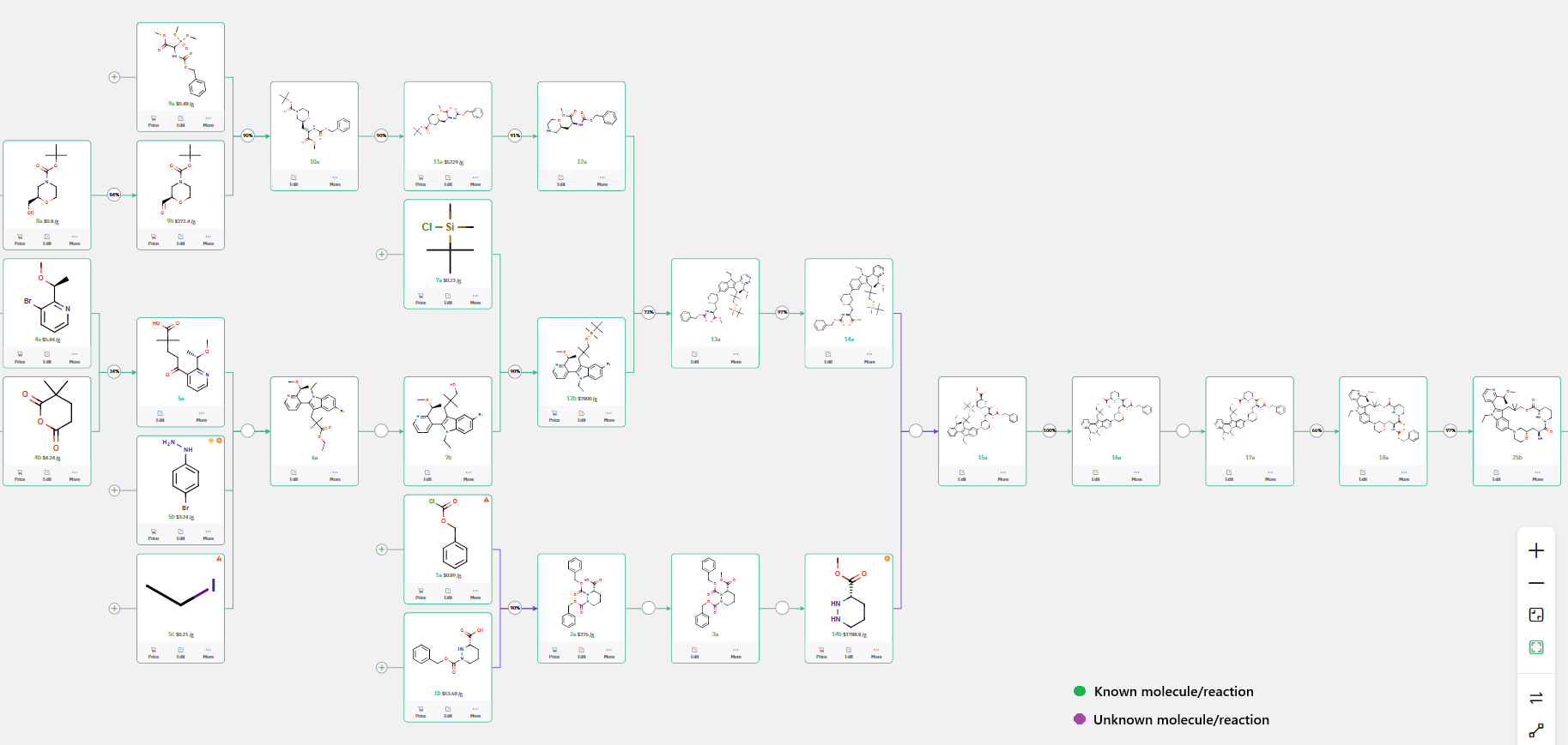 Additionally, ChemAIRS identified several commercially available building blocks (e.g., 22b, 23b), facilitating procurement and synthesis planning.