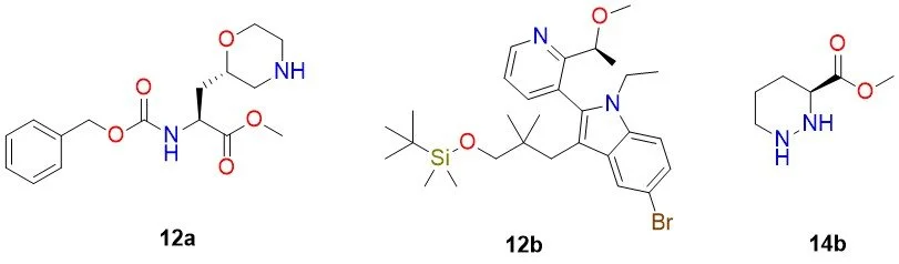 While the preparation of 12a and 12b follows reported procedures (US2021/130303), ChemAIRS proposed a de novo 3-step synthesis of 14b (methyl (S)-hexahydropyridazine-3-carboxylate), circumventing the need for costly commercial procurement (Schemes 3 and 4).