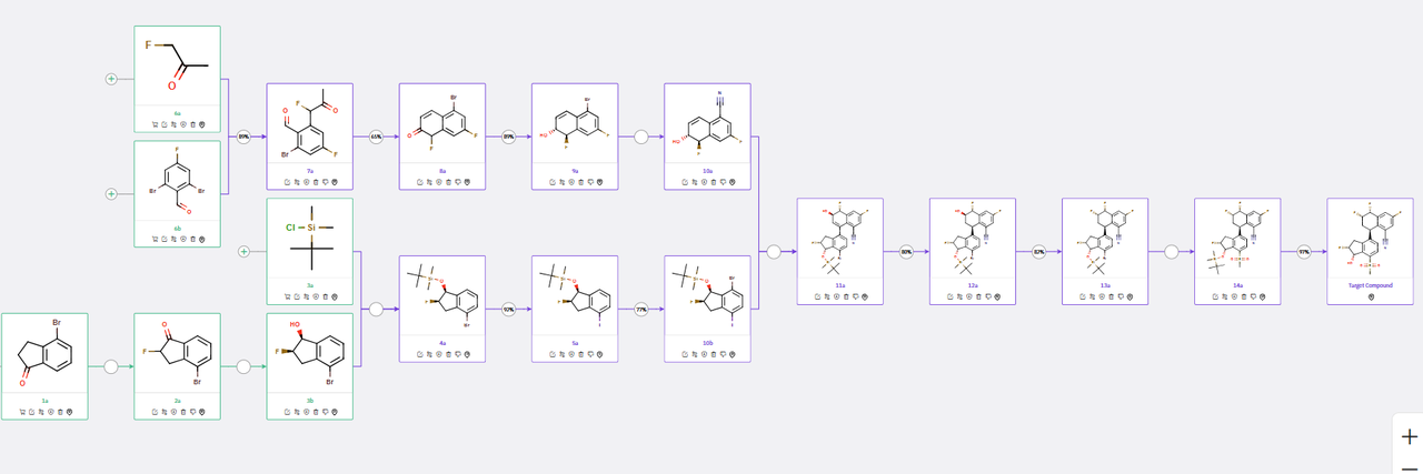 The synthetic route begins with a key coupling reaction between intermediates 10a and 10b, derived from readily accessible commercial precursors such as dibromo benzaldehyde (6b) and bromo indanone (1a) (Scheme 1). The synthesis of 10a follows a four-step sequence as proposed by ChemAIRS, differing from the multistep approach outlined in the corresponding patent. This route initiates with the coupling of fluoroketone 6a and dibromo benzaldehyde 6b, followed by an intramolecular aldol condensation to yield compound 8a. Subsequent steps involve ketone reduction and Pd-catalyzed cyanation, ultimately affording intermediate 10a.