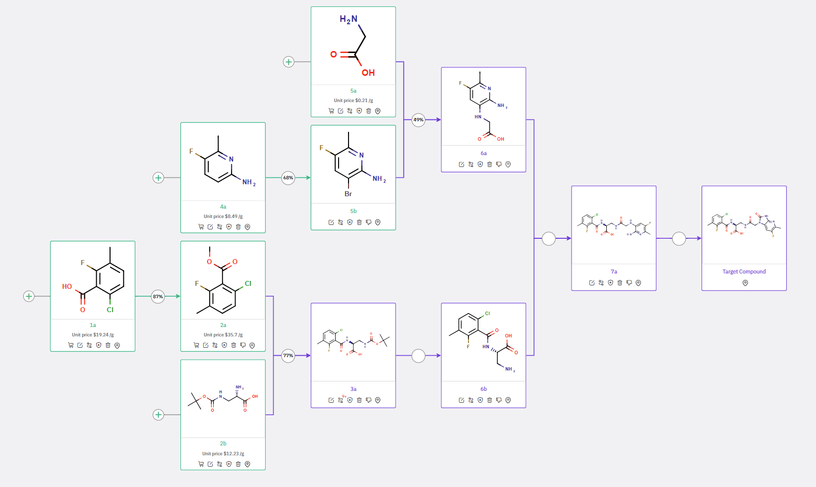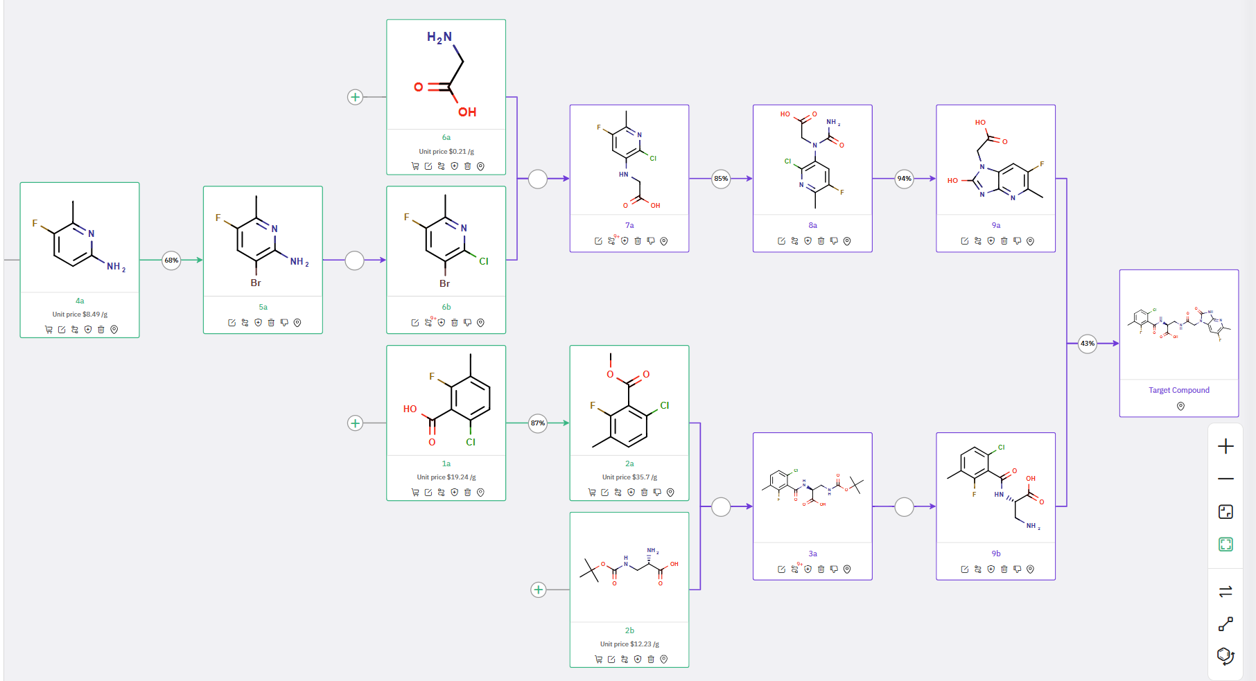 For the synthesis of intermediate 6b, ChemAIRS proposed an alternative to the literature-reported method, which involved protected building blocks such as diaminoester. Instead, ChemAIRS recommended using Boc-amino alanine (compound 2b), with the proposed pathway involving an amidation between compounds 2a and 2b to produce compound 3a, followed by Boc-deprotection to yield compound 6b.
