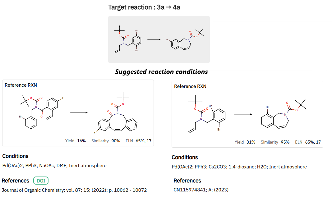 ChemAIRS proposed an alternative cyclization via an intramolecular Heck reaction, utilizing Pd catalysts. The system also identified a range of catalyst options to fine-tune this transformation for improved yield and selectivity (Figure 4).