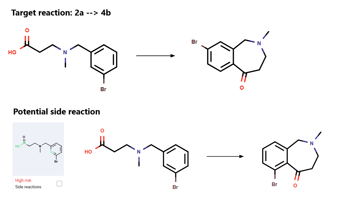 The F-C acylation served as the critical ring-forming step, though it proved challenging, with modest yields reported by Biogen. ChemAIRS proposed optimized reaction conditions to improve this transformation (Figure 2). Additionally, the algorithm flagged potential side reactions that could compromise the cyclization efficiency (Figure 3), providing insights into reaction optimization.