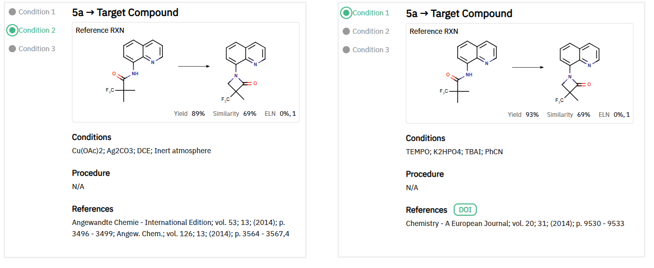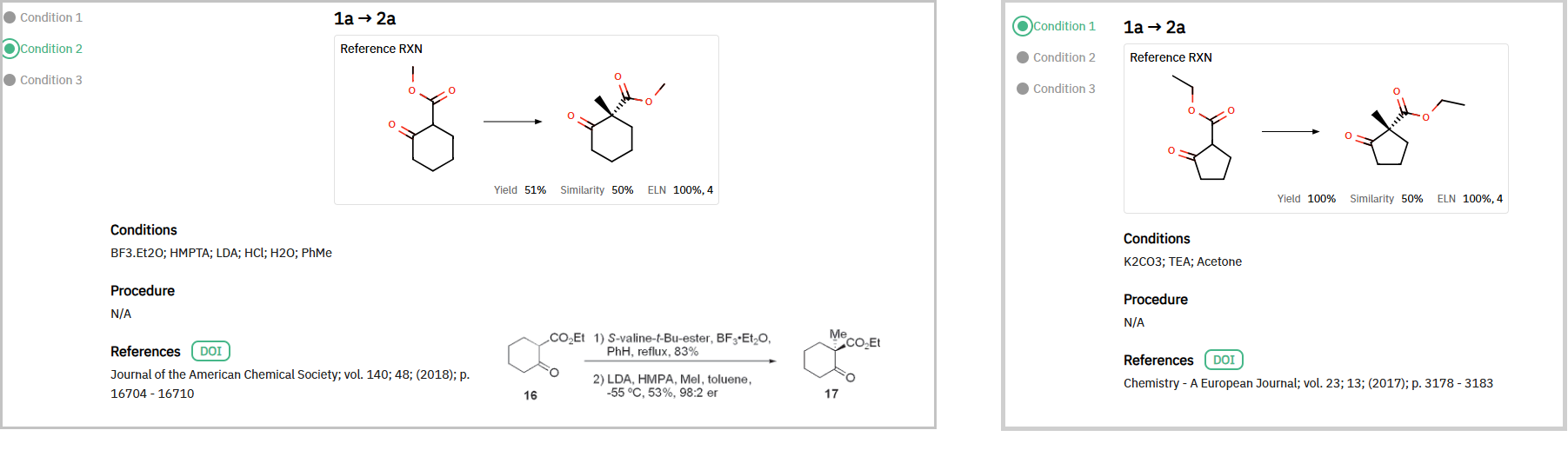 Figure 1: ChemAIRS suggested two reaction conditions for intramolecular cyclization