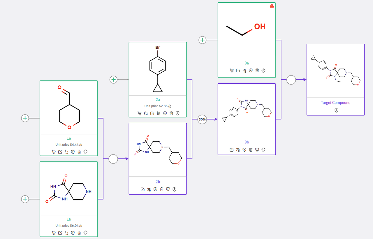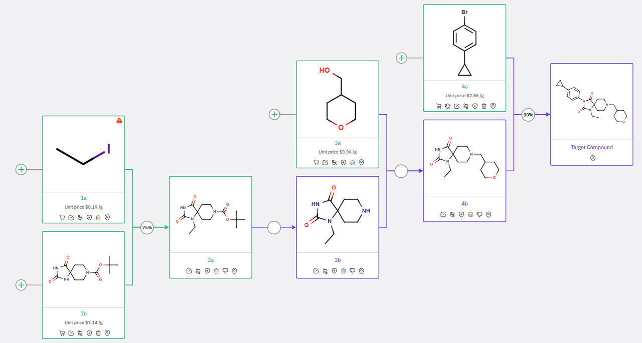 The results were generated within minutes, providing researchers with a range of viable options to efficiently synthesize de novo compounds based on building block availability and costs.