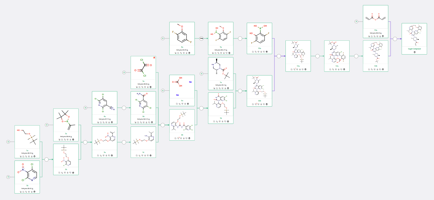 ChemAIRS generated multiple synthetic pathways to the target macrocyclic molecule. One of these pathways (Scheme 1) closely aligned with the synthesis recently reported by Merck. Additionally, our retrosynthesis platform proposed an alternative synthetic route for compound 11a, starting from boronic acid 10 and proceeding via a 2-step process, as opposed to the 3-step synthesis from potassium (3,6-difluoro-2-hydroxyphenyl) trifluoroborate found in the literature. In the final step, the system suggested an alternative reaction condition using acrylic anhydride and methylmorpholine instead of the reported acryloyl chloride/DIPEA combination.