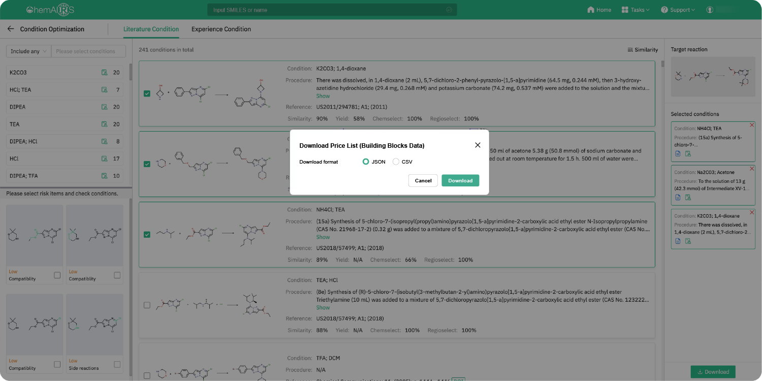That’s where ChemAIRS®’ Condition Search comes in. Think of it as your smart assistant for reaction design, helping you navigate the endless variables and pinpoint the best conditions.